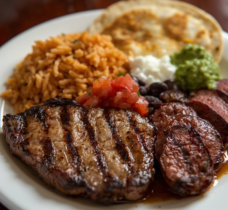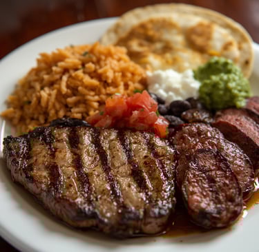 Grilled marinated steak, house made chorizo, served with side of rice and beans, pico de gallo, guacamole and side of tortillas.